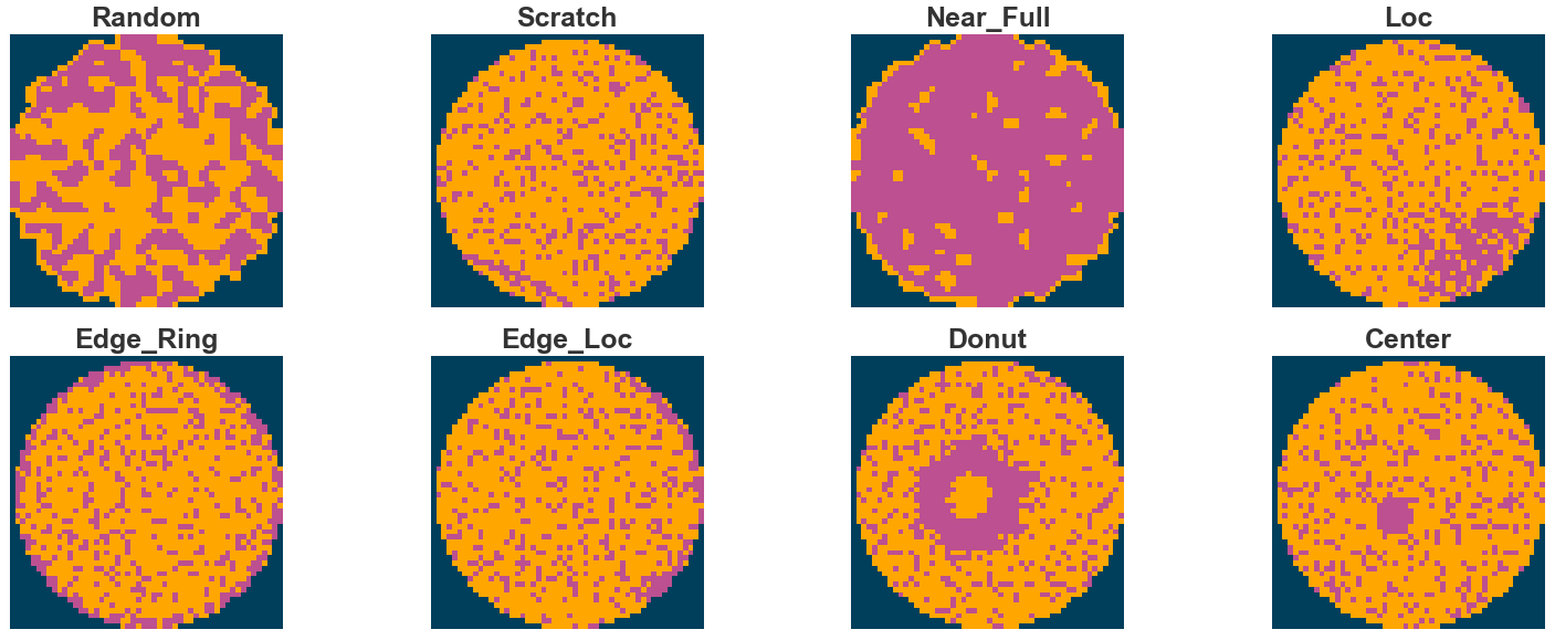 - The labels in the data are using one-hot encoding, a total of 8 dimensions, corresponding to the 8 basic types of wafer map defects (single defect).